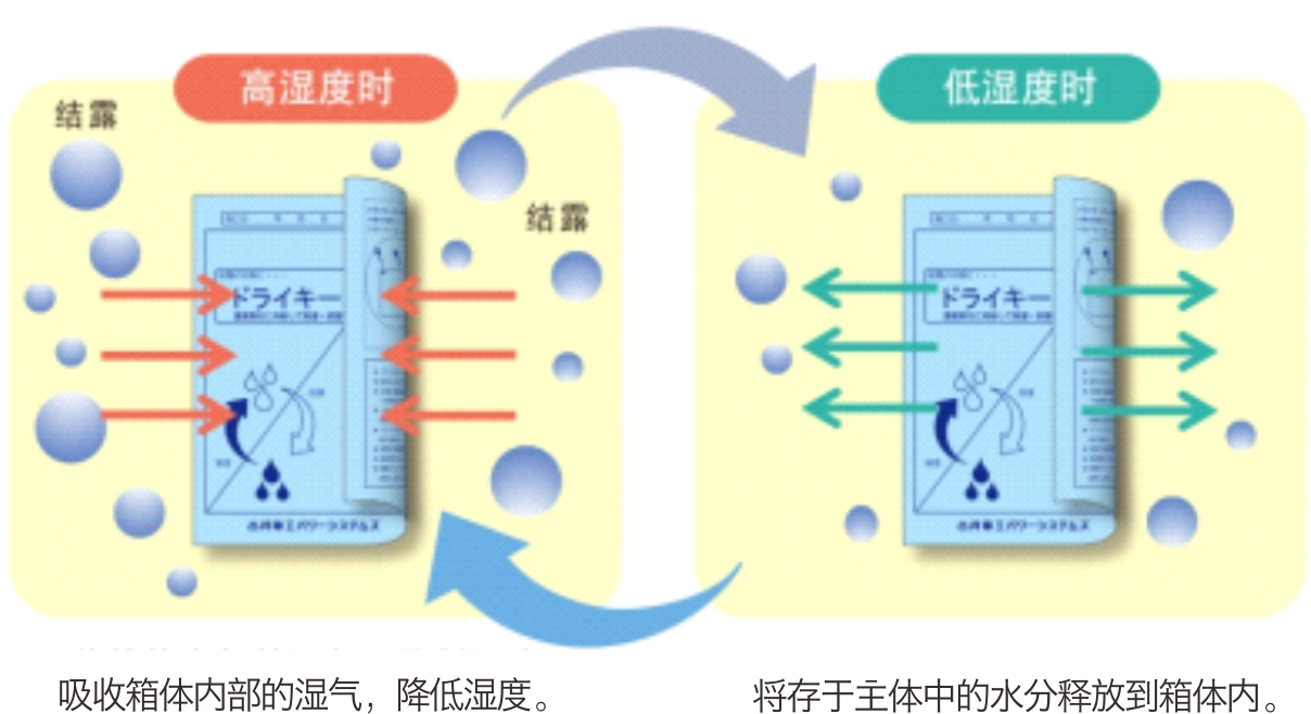 01.具有可逆性:通过在高湿度时吸湿、在低湿度时放湿来调整湿度,保持湿度稳定。通过该湿度调节功能,可长时间保持除湿效果,是能够有效应对结露现象的吸湿片;